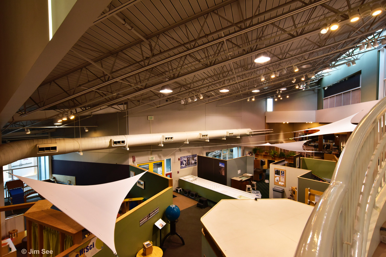The interior is even more playful than the exterior. Once inside, the volumes flow together, allowing visitors to discover specialty areas or wander and wonder at interactive displays of science and art. Changes in ceiling height, balconies that overlook fascinating attractions, stairs and ramps, views inside and outside, a fountain with water jets in the shape of parabolas, and a big elevator with a sofa and piano are a few of the architectural and exhibit features that delight and intrigue children of all ages.