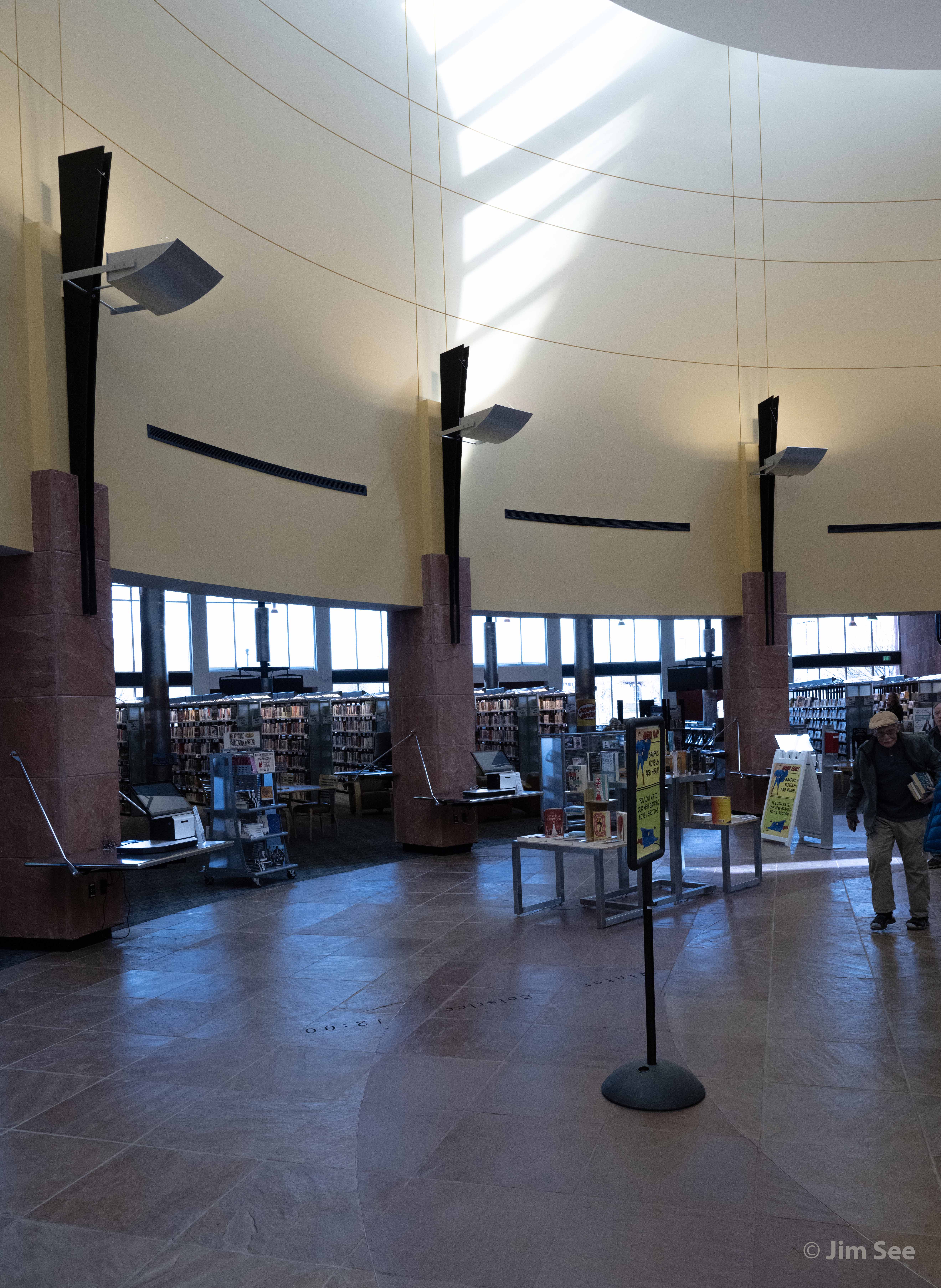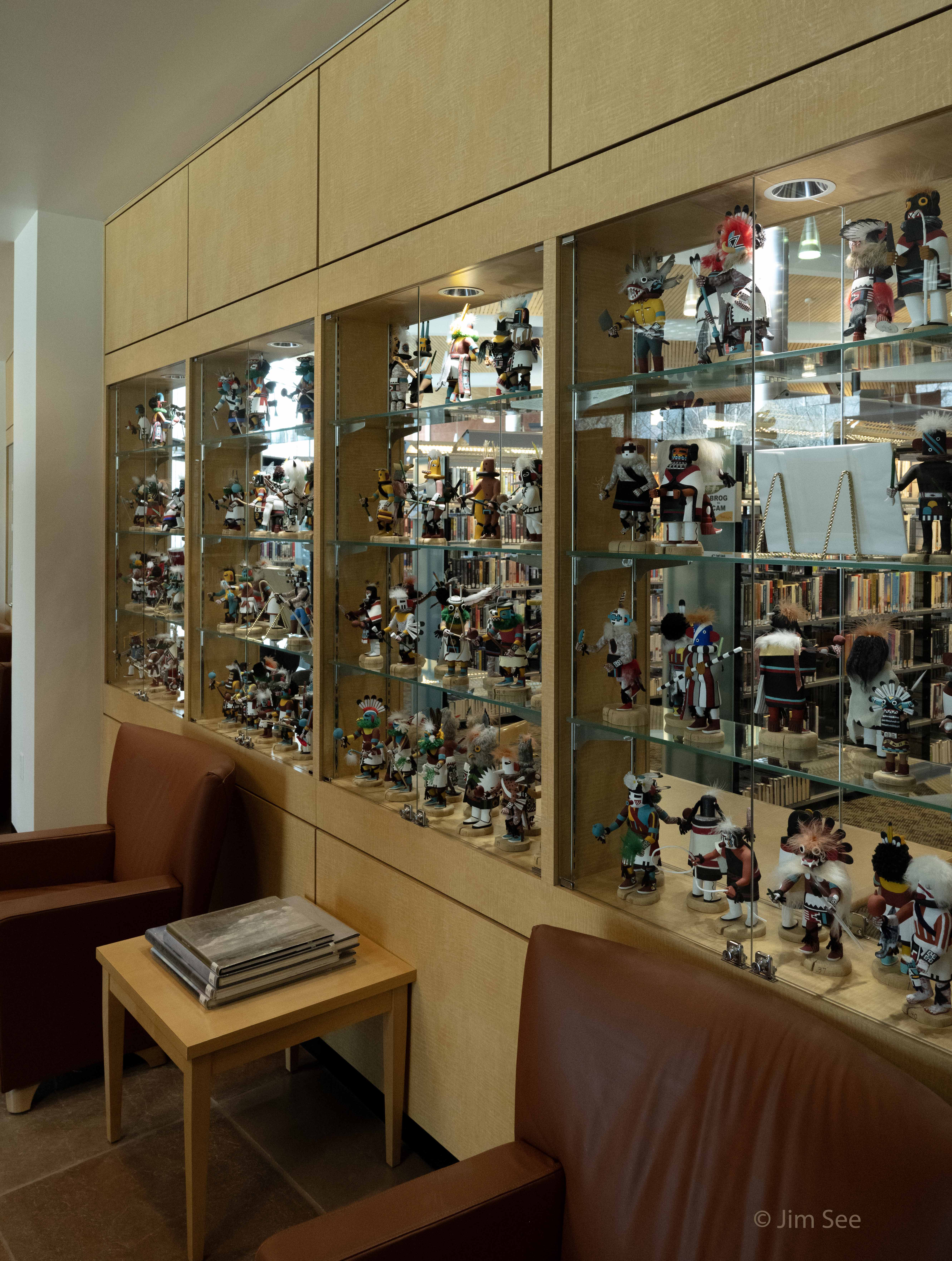 The major stack areas to the north and west radiate from the central rotunda that houses the circulation and information services. This radial pattern takes advantage of natural lighting from the exterior walls and the clerestory windows in the rotunda. Images of local petroglyphs and regional Native American iconography are etched on interior glass panels and display cases. An extensive collection of Pueblo kachinas is housed in this area.